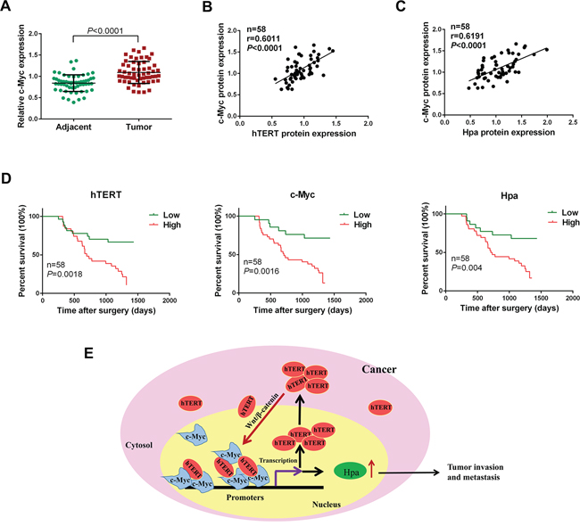 We showed that c-Myc was expressed at a higher level in GC tissues compared with adjacent normal tissues (Figure 7A). The expression of c-Myc was positively correlated with both hTERT and Hpa in GC (Figure 7B and 7C). As shown in Table 1, high expression levels of hTERT and Hpa were closely correlated with an advanced TNM stage and lymphatic metastasis. The survival analysis revealed that high expression levels of hTERT, c-Myc and Hpa were strongly associated with a decreased survival time and poor prognosis (Figure 7D), suggesting an important role of hTERT, c-Myc and Hpa expression in predicting the prognosis of patients with gastric cancer.