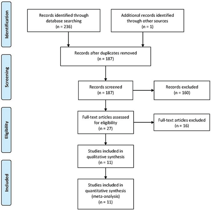 A total of 237 potential studies were identified by preliminary searching PubMed, Web of Science, Science Direct, EMBASE, and Cochrane Library databases, among which 7 case-control studies and 4 cohort studies were selected, involving a total of 5898251 subjects in this meta-analysis. The detailed literature search strategy was showed in Figure 1. The baseline characteristics, such as author name, publication year, ethnicity, design, age, gender, sample size, and covariants were depicted in Table 1. The quality of the 11 studies was high.