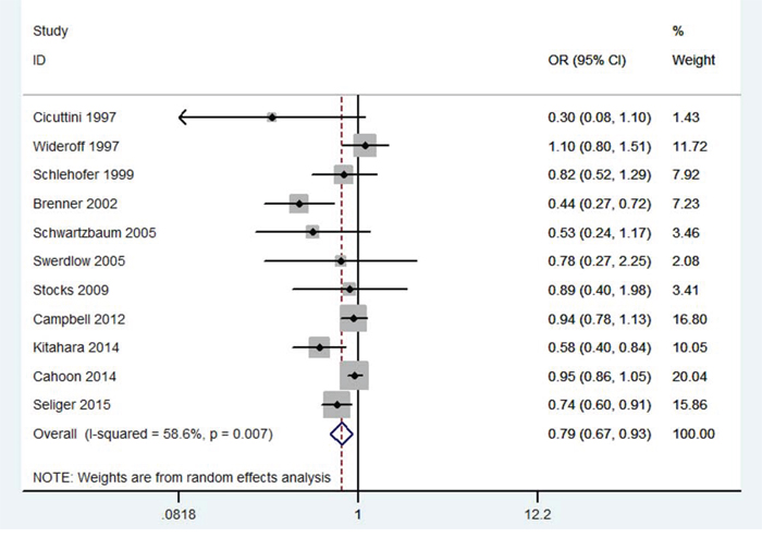 As shown in Figure 2, DM was significantly associated with decreased risk of gliomas (OR = 0.79; 95% CI 0.67 – 0.93; P = 0.004; I2 = 59%). In the subgroup analysis of race, Caucasians of DM showed decreased risk of gliomas (OR = 0.81; 95% CI 0.69 – 0.94; P = 0.007). In the subgroup analysis of design, a statistically significant protective effect of DM on gliomas was observed in case-control studies (OR = 0.68; 95 % CI, 0.53–0.87; P = 0.002), while no such effect was observed in cohort studies (OR = 0.97; 95 % CI, 0.83–1.13; P = 0.70). In a further stratified analysis by gender, a significant association was found among males with DM (OR = 0.83; 95 % CI, 0.70–0.99; P = 0.04). No significant association was found between females with DM and gliomas (OR = 0.97; 95 % CI, 0.78–1.21; P = 0.81). The results were showed in Table 2.