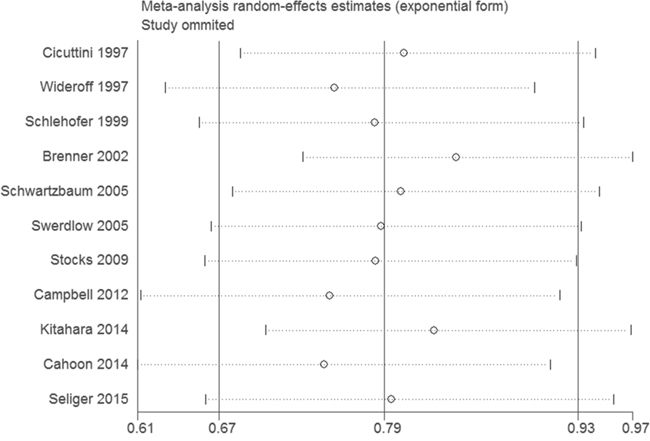 Figure 3: Sensitivity analysis of the association between DM and risk of gliomas.