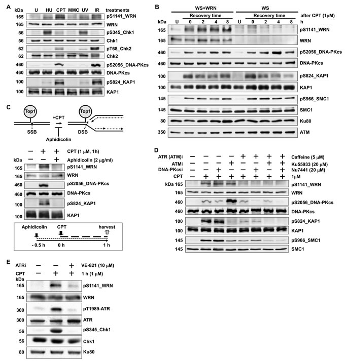 Figure 1: WRN is phosphorylated at serine 1141 by ATR in response to replication-associated DSBs. A. WRN is heavily phosphorylated at S1141 in response to CPT treatment of cells. HeLa cells were mock-treated or treated with 3 mM HU, 5 µM MMC, 10 J/m2 ultraviolet light (UV), or 5 Gy ionizing radiation (IR). Cells were harvested 1 h after treatment and analyzed for WRN, Chk1, Chk2, DNA-PKcs and KAP1 phosphorylation events by western blotting. B. WRN is phosphorylated at S1141 in response to replication stress. hTERT immortalized WS cells stably transfected with empty vector (WS) and WS cells stably expressing wild-type WRN (WS+WT) were mock-treated (lane U) or treated with 1 µM CPT for 1 h. Cells were harvested at indicated times and analyzed for CPT-induced phosphorylation of WRN at S1141 using anti-pS1141 antibodies by western blotting. Western blots for total and phosphorylated DNA-PKcs, KAP1, SMC1, and Chk2 were also performed. C. Phosphorylation of WRN at S1141 is triggered by replication-associated DSBs. HeLa cells were pre-treated with aphidicolin (2 µg/ml) for 0.5 h and then either mock- or CPT-treated (1 µM) for 1 additional h. Cells were harvested after CPT treatment, and phosphorylation of WRN, DNA-PKcs, and KAP1 was analyzed by western blotting. A graphical sketch of CPT-induced DNA double-strand breaks and experimental design are shown above and below images of western blots, respectively. D. WRN phosphorylation at S1141 in response to replication-associated DSBs is sensitive to caffeine treatment. HeLa cells were pre-treated with 5 µM caffeine, 20 µM Ku55933, or 20 µM Nu7441 either alone or in combination for 1 h and then mock- or CPT-treated (1 µM) for 1 h. Cells were harvested 1 h after treatment and analyzed for phosphorylation of WRN, DNA-PKcs, KAP1, and SMC1 by western blotting. E. Phosphorylation of WRN at S1141 in response to replication-associated DSBs is mediated by ATR. HeLa cells were treated with either DMSO or 10 µM ATR (VE-821) -specific inhibitor. Two h after exposure to ATR inhibitor, cells were either mock- or CPT-treated (1 µM) for 1 h. The cells were harvested 1 h after the treatment and examined for phosphorylation of WRN, ATR and Chk1 by western blotting.