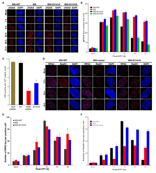 HR is initiated by DNA-end resection followed by Rad51-dependent strand invasion into duplex DNA and the pairing of homologous DNA strands. Therefore, reduced levels of HR repair in WS+S1141A cells could be either due to defective DNA end-resection or inefficient recruitment of Rad51. We first examined DNA-end resection using RPA2 as a surrogate marker in WS, WS+WT, and WS+S1141A cells following replication stress (Figure 3D). In CPT-treated WS+WT cells, the number of RPA2 foci increased gradually and reached a maximum around 12 h (110.44+1.2 foci per cell) and then declined to 40+7.4 foci at 48 h (Figure 3E). In contrast, in CPT-treated WS and WS+S1141A cells the number of RPA2 foci rose more rapidly and reached a maximum around 12 h (95.55+2 and 91.21+2.8 foci per cell, respectively). In both WS and WS+S1141A cells, RPA2 foci persisted and were maintained near maximal levels (78.31+10.6 and 63.1+3.9 foci per WS and WS+S1141A cell, respectively) at 48 h (Figure 3E). Thus, the extent of DNA-end resection is independent of WRN-phosphorylation and the presence of persistent RPA2 foci both in WS and WS+S1141A cells reflects unrepaired replication-associated DSBs in these cells.