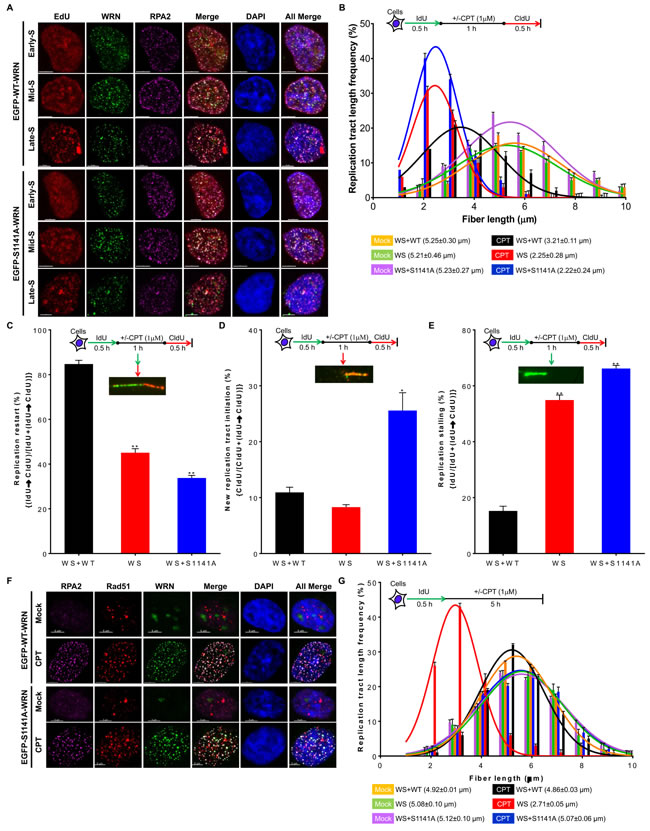 In addition to DSB repair, WRN also functions in replication fork processes [11]. Therefore, we examined whether WRN phosphorylation influences its recruitment to sites of perturbed replication forks. Similarly to a previous finding [11], WT and S1141A WRN clearly juxtaposed with the EdU-labeled replication sites in CPT-treated early-, mid-, and late-S-phase cells (Figure 4A). We confirmed these results using PCNA as a surrogate marker for replication forks. We found that WRN clearly juxtaposed with PCNA foci in CPT treated WS+EGFP-WT WRN cells (Figure S3). Additionally, both WT and S1141A WRN foci clearly co-localized with RPA2 in all S-phase cells (Figure 4A). Thus, recruitment of WRN to the sites of perturbed replication forks is independent of its phosphorylation at S1141. Therefore, it is reasonable to assume that the replication fork processes would be similar between WS+WT and WS+S1141A cells after replication stress. We monitored replication fork progression, stalling, and new origin firing and stability using a single-molecular DNA fiber technique [11]. As shown in Figure 4B, IdU tract lengths in mock-treated WS, WS+WT, and WS+S1141 cells were nearly the same (5.25+0.3, 5.21+0.46, and 5.23+0.27 µm, respectively). In contrast, CPT treatment reduced the CldU tract lengths relative to the IdU tract lengths in all tested cells, reflecting the slowing of replication fork elongation upon CPT treatment (Figure 4B). Notably, the DNA fiber lengths (CldU lengths) were significantly shorter in CPT-treated WS and WS+S1141A cells (2.25+0.28 and 2.22+0.24 µm in WS and WS+S1141A cells, respectively; p = 0.027 and p = 0.038) than in CPT-treated WS+WT cells (3.21+0.11 µm, Figure 4B). Furthermore, cell cycle analysis clearly showed that S1141 phosphorylation plays a critical role in the progression of S-phase cells upon collapsed replication forks (Figure S4). Thus, as shown previously [27], ATR-mediated WRN phosphorylation is involved in the recovery of replication forks in response to replication stress.
