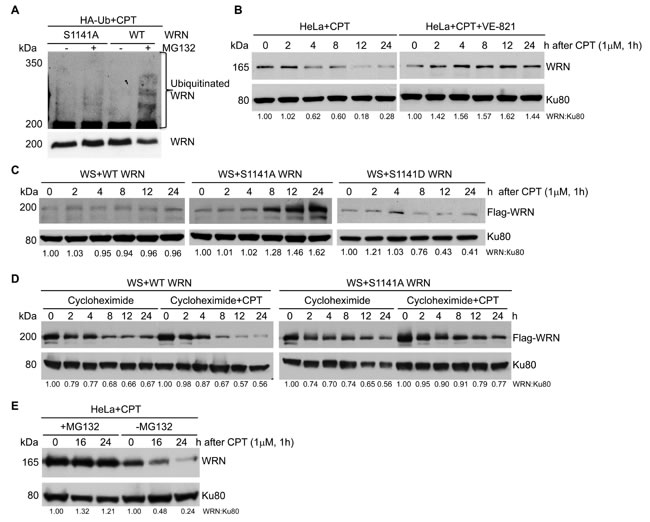 For protein stability assay, WS+WT and WS+S1141A cells were co-treated with 30 µg/ml cycloheximide (Sigma) and 1 μM CPT (Sigma). For WRN ubiquitination assay, WS+WT and WS+S1141A cells were transfected with HA-Ub plasmid using Lipofectamine 2000 (Invitrogen). After 36 h, cells were treated with 25 µM MG132 (Calibiochem) and 1 µm CPT for 1 h. Cells were washed with 1xPBS and maintained in growth medium containing MG132 for 16 hours. Cells were harvested and WRN was immunoprecipitated from the total cell extract using anti-Flag (Sigma) antibodies. Subsequently, the immune complex was separated onto a 6% SDS-PAGE and probed with anti-HA and anti-WRN antibodies.