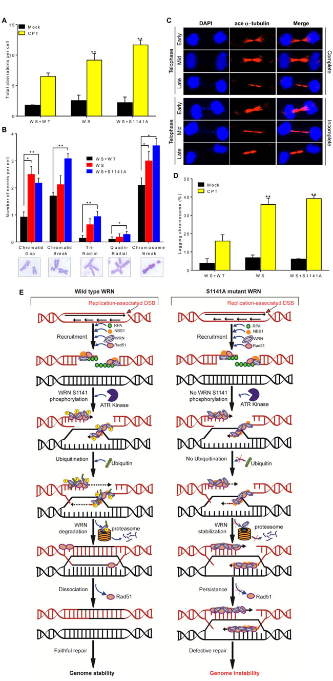 Figure 6: ATR-mediated WRN phosphorylation functions in genome stability maintenance. A.-B. ATR-mediated WRN phosphorylation prevents chromosome instability. Exponentially growing WS, WS+WT, and WS+S1141A cells were treated with CPT for 1 h. After 12 h, chromosome preparations were made by accumulating mitotic cells in the presence of 0.1 mg/ml colcemid for 5 h. For each cell type, more than 50 metaphase spreads were counted. A. Total aberrations for each cell type. B. The number of types of aberrations per cell. Data was obtained by averaging results from three independent experiments. Error bars represent STDEV. * indicates P<0.005 and ** indicate P < 0.0005. C.-D. ATR-mediated WRN phosphorylation facilitates anaphase chromosome separation. C. Representative cell images show complete (top) and incomplete (bottom) chromosome separation in early-, mid- and late-telophases. D. Graph shows the percentages of cells with mis-separated chromosomes in WS, WS+WT, and WS+S1141A cells. Cells were treated with 1 µM CPT for 1 h. After 72 h, cells were fixed with 4% paraformaldehyde and incubated with acetylated anti-α−tubulin antibodies for indirect immunostaining. The average number of mis-segregated chromosome in > 100 acetylated α−tubulin-positive telophase junctions from three or four independent experiments was calculated. ace α−tubulin-acetylated α−tubulin; Error bars represent STDEV. ** indicate P < 0.001. E. Model depicting the mechanism of ATR-mediated WRN phosphorylation at S1141 in genome stability maintenance in response to replication-associated DSBs.