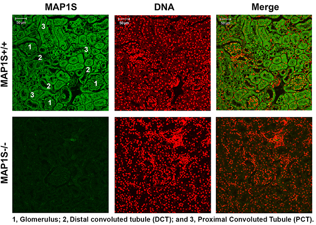 Animal protocols were approved by the Institutional Animal Care and Use Committee, Institute of Biosciences and Technology, Texas A&M Health Science Center. All animals received humane care according to the criteria outlined in the “Guide for the Care and Use of Laboratory Animals” prepared by the National Academy of Sciences and published by the National Institutes of Health (NIH publication 86-23 revised 1985). Wild-type (MAP1S+/+) and MAP1S knockout (MAP1S−/−) mice were generated and amplified in a C57BL/6 background as described in detail in our previous publication [19]. Twelve month-old male mouse littermates were sacrificed to collect renal tissues for immunofluorescent analysis with a confocal microscopy as described [42].
