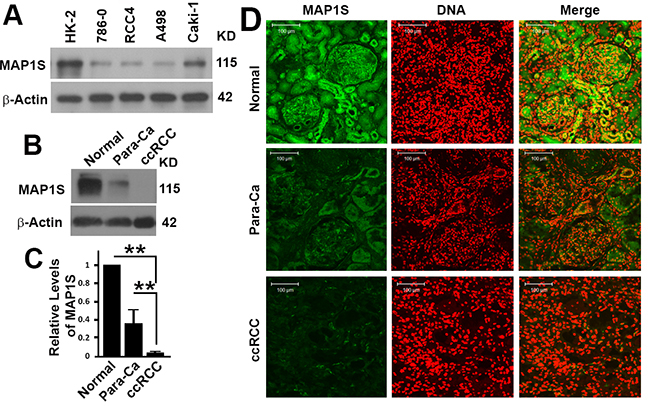 Figure 2: The levels of MAP1S protein in human renal cancer cell lines and cancer tissues. A. Representative immunoblot showing the levels of MAP1S in different renal cell lines. B. Representative immunoblot showing the levels of MAP1S in normal, clear cell renal cell carcinoma (cc-RCC) and its adjacent tissues (para-Ca) from the same patient. C. The quantification of the relative intensities of MAP1S to β-Actin as shown in (B) in tissue samples collected from 8 patients. D. Representative images showing the immuno-florescent staining of MAP1S and nuclear DNA in the normal, para-Ca and cc-RCC tissues from the same patients.
