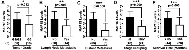 Figure 4: Relation between MAP1S levels and clinical features of ccRCC patients. A–E. Comparative plots of MAP1S levels of ccRCC patients between different tumor grades (A), different states of lymph node metastasis (B), different states of distant metastasis (C), different stage grouping (D), and different survival times (E). Bars represent mean ± standard deviation of MAP1S levels between different groups. Significance is estimated by Student’s T Test with two-tailed distribution and unequal variances. (n) showing the number of patients. *, p < 0.05; **, p < 0.01; ***, p<0.001.