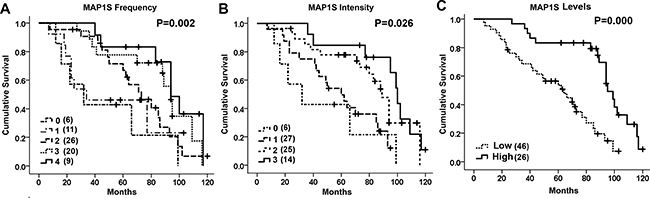 Figure 5: The Kaplan-Meier survival curves. A–C. The curves showing the cumulative survival time of ccRCC patients with different frequencies (A), different intensities (B), and high or low levels of MAP1S (C). In panel A, 0, no cell; 1, 1–10%; 2, 11–50%; 3, 51–80%; and 4, >80% cells were stained. In panel B, 0, no staining; 1, cells were weakly; 2, moderately; and 3, strongly stained. In panel C, high, ≥4; and low <4 in their combined scores for intensity and frequency. Case number for each group is provided inside the parentheses. The significance of difference between two groups was estimated by chi-square test.
