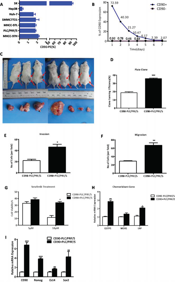 Figure 2: CD90+ HCC cells exhibited characteristics of cancer stem cells. A. By FACS analysis, the HCC cell lines tested varied in CD90 expression levels. B. When CD90+ and CD90- cells both isolated from PLC/PRF/5 cell line were separately cultivated in 10% serum-supplemented medium for one week, after which CD90 expression was analyzed in each population by FACS analysis. The proportion of CD90+ cells was dramatically declined and reverted almost to the presorting level after 6 days, whereas CD90- cells retained low proportion even after 1 week. C. Efficiency of tumor formation of CD90+ cells isolated from PLC/PRF/5 cell line (7/9, as shown in Supplementary Table 1). Right flanks of mice were injected with CD90+ cells while left flanks were injected with CD90- cells. Red arrows indicated the site of tumor formation. D. By colony formation assay on the sorted cells of PLC/PRF/5, it was demonstrated that CD90+ HCC cells had a significantly higher proliferation rate when compared with CD90- cells (***P < 0.005, t test). E, F. Using trans-well migration and invasion assays, it was shown that the CD90+ cells sorted from PLC/PRF/5 cells had enhanced invasive (*P < 0.05, t test) and migratory (**P < 0.01, t test) properties in vitro. G. CD90+ and CD90- cells derived from PLC/PRF/5 were treated with 5 or 10 μM sorafenib for 48 hours. Percentages of cell survival are shown (*P < 0.05, t test). H. Expression levels of drug-resistance relative genes were determined by qRT-PCR (*P < 0.05, **P < 0.01, t test). I. CD90+ cells from PLC/PRF/5 overexpressed several genes related to stemness when compared with CD90- cells (**p < 0.01, ***P < 0.005, t test).