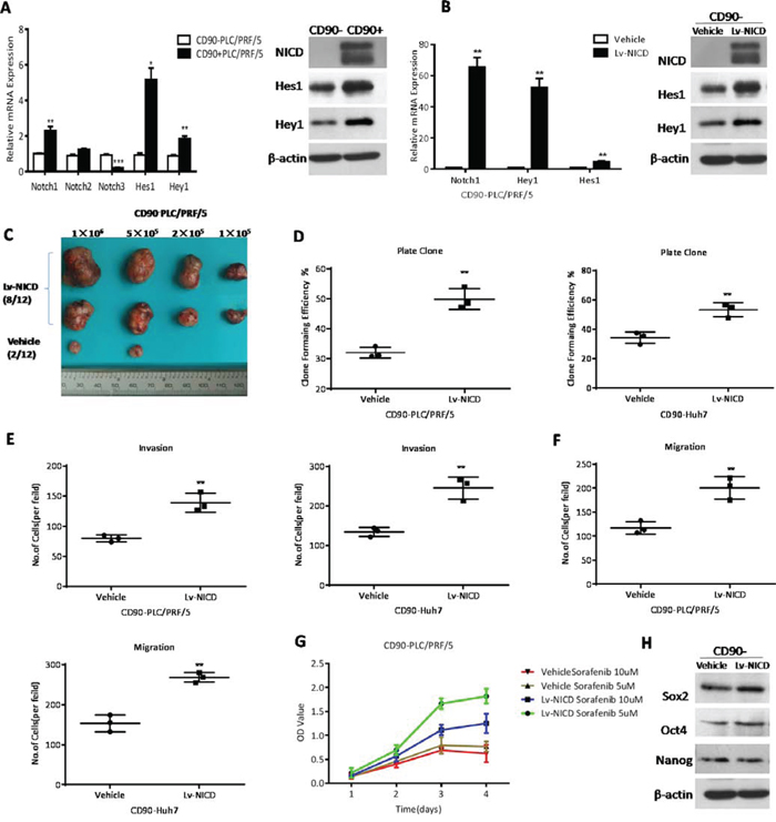 Figure 3: The activation of Notch signaling pathway enhanced the cancer stem cell features of CD90- HCC cells. A. CD90+ cells from PLC/PRF/5 overexpressed the core components of Notch pathway by qRT-PCR and WB when compared to CD90- cells (*P < 0.05, **p < 0.01, ***P < 0.005, t test). B. Elevated expression of Notch (Notch1 and NICD), Hes1 and Hey1 by qRT-PCR and WB was observed after transinfection with Lv-NICD in CD90- cells (**p < 0.01, t test). C. The efficiency of tumor formation of CD90- PLC/PRF/5 cells after transinfection with Lv-NICD (8/12) or control lentivector (2/12, as shown in Supplementary Table 2). D. Colony formation efficiency of CD90- cells from PLC/PRF/5 and Huh7 after overexpression of NICD (**p < 0.01, t test). E, F. Migratory and invasive activities of CD90- cells from PLC/PRF/5 and Huh7 were determined by transwell assay (**p < 0.01, t test). G. CCK8 assays were used to measure the viability of CD90- PLC/PRF/5 with empty vector or Lv-NICD after treatment of 5 and 10 μM sorafenib. H. CD90- PLC/PRF/5 cells transinfected with Lv-NICD exhibited enhanced expression of Sox2 and Nanog by WB, vehicle as controls.