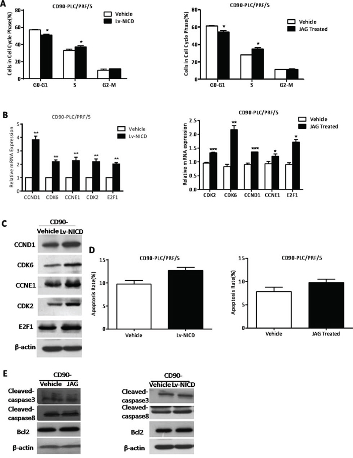 Figure 5: The activation of Notch signaling promoted G1-S transition in the cell cycle phase of CD90- HCC cells. A. By FACS analysis, CD90- cells treated with Lv-NICD or Jagged1 exhibited a decreasing proportion of cells in G0-G1 phase and an increasing proportion of cells in S phase, compared with controls (*P < 0.05, t test). B, C. The detection of G1-S transition associated genes in CD90- cells treated with Lv-NICD or Jagged1 by qRT-PCR and WB (*P < 0.05, **p < 0.01, ***P < 0.005, t test). D, E. By FACS analysis, the apoptosis rate of CD90- cells after activation of Notch pathway was shown and the apoptosis-related genes were determined by WB.