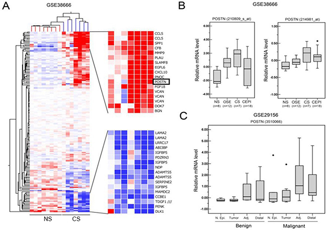 Figure 1: POSTN is upregulated in stroma of epithelial ovarian adenocarcinoma. A. Clustering analysis of differentially expressed genes that are annotated to be expressed in extracellular space between normal stroma (NS) and cancer stroma (CS). B. Relative POSTN levels in normal stroma (NS), normal ovarian surface epithelium (OSE), cancer stroma (CS), and cancer epithelium (CEPI) in GSE38666. C. Relative POSTN levels in normal epithelium (N. Epi), tumor, adjacent cancer stroma (Adj), and distal cancer stroma (distal) between benign tumor and malignant tumor in GSE29156.