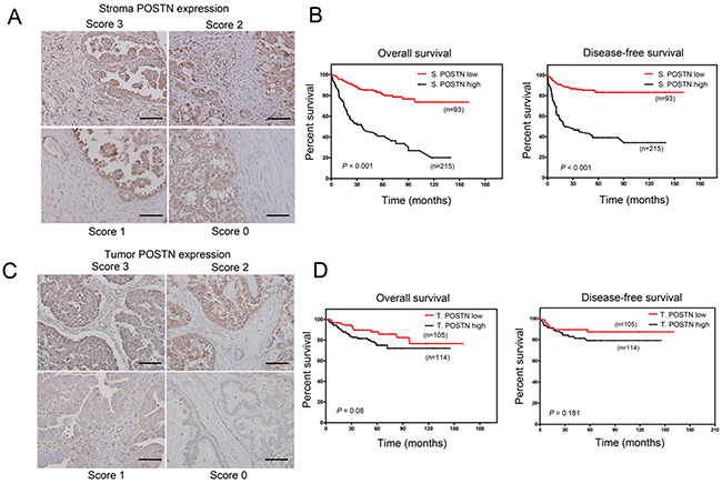 Figure 2: Overexpression of stromal POSTN predicts worse survival compared to tumor POSTN in EOC and borerline cancer patients. A. Representative IHC staining of stroma POSTN expression scores. Scale bar: 100 μm. B. Kaplan–Meier analysis of overall survival (OS) and diseases-free survival (DFS) in 308 EOC patients stratified by high periostin expression (score 3) and low periostin expression (score 0-2) in tumor stroma. C. Representative IHC staining of tumor POSTN expression scores. Scale bar: 100 μm. D. Kaplan–Meier analysis of overall survival (OS) and diseases-free survival (DFS) in 308 EOC patients stratified by high periostin expression (score 3) and low periostin expression (score 0-2) in tumor.
