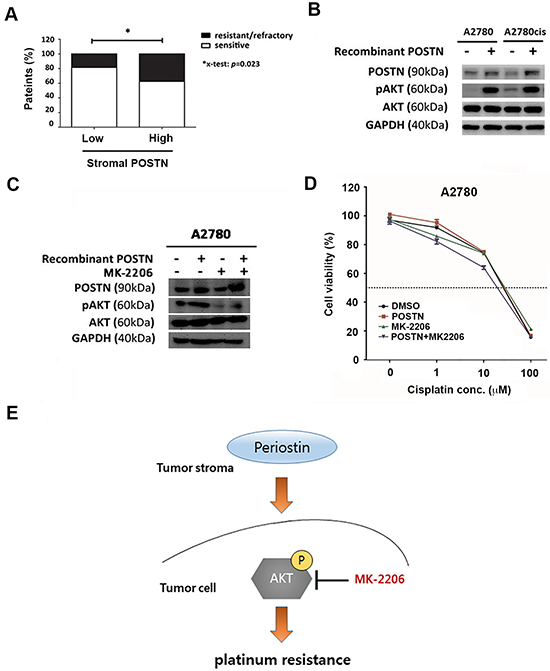 Figure 4: POSTN induces platinum resistance via PI3K/AKT pathway. A. Bar chart represents percentage of platinum resistance in patients with high levels of stromal POSTN expression and those with low levels of stromal POSTN. B. Western blot analysis of POSTN, phosphor-AKT, total AKT, and GAPDH protein expression in A2780 cells and A2780 cisplatin-resistant cells. C. Western blot analysis of endogenous POSTN, phosphor-AKT, total AKT, and GAPDH protein expression in A2780 cells upon recombinant POSTN protein and/or MK-2206 treatment. D. Cytotoxicity assay of A2780 cells treated with cisplatin at indicated concentration in the presence or absence of recombinant POSTN (1μg/ml) or AKT inhibitor, MK-2206 (1 μM). Recombinant POSTN increased cisplatin IC50 of A2780 from 18 μM to 23 μM and then decreased to 14 μM after adding MK-2206. E. Schematic model shows the relationship between stromal POSTN and the development of platinum resistance in ovarian cancer. Periostin in cancer stroma can activate intracellular AKT-S473 phosphorylation to promote platinum resistance, which can be reversed by AKT inhibitor, MK-2206.