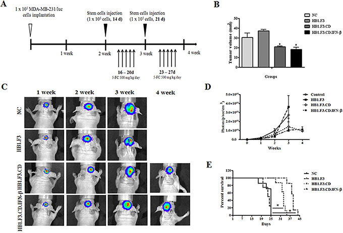 Figure 1: Mouse model for breast cancer metastasis to brain and therapeutic effect of stem cells expressing therapeutic genes, cytosine deaminase (CD) and/or interferon-beta (IFN-β). Luciferase labeled MDA-MB-231 breast cancer cells were implanted in the right hemisphere of anesthetized nude mice (AP + 1.0 mm, ML + 1.7 mm, DV −3.2 mm). Three stem cell lines, HB1.F3, HB1.F3.CD, and HB1.F3.CD. IFN-β cells, were transplanted to the opposite hemisphere of mice after two weeks. To activate the CD gene in stem cells, 5-FC (500 mg/kg/day) was administrated as a prodrug via intraperitoneal (i.p.) injection once a day 5 days per week for 2 weeks. (A) Schematic diagram of mouse models. (B) Volume of excised brain tumor. After the final 5-FC injection, brains were excised from several mice to measure tumor burden inside the brain (n = 8). (C) Bioluminescence imaging. During the experimental period, living images of all groups of mice were acquired at the indicated weeks. (D) Bioluminescence values (photons/sec/cm2/sr) (n = 8). (E) Survival rate of mouse models. Data shown are the mean ± SEM. *p < 0.05 vs. negative control (n = 8).