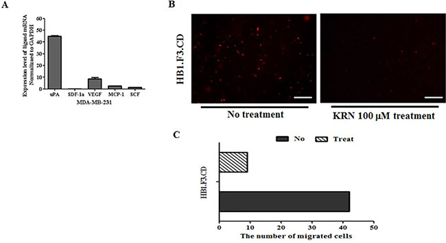 Figure 3: Effects of the vascular endothelial growth factor and their receptor 2 (VEGF/VEGFR2) pathway on stem cells migration. (A) Chemoattractant factor secreted by MDA-MB-231 breast cancer cells. Total RNA was obtained from MDA-MB-231 and investigated by real time PCR with SYBR green and ROX dye. (B) Transwell assay after treatment with the VEGFR2 inhibitor, KRN633. After treatment of stem cells in the culture dish with 100 μM KRN633, CM-DiI stained HB1.F3.CD cells were seeded in the upper chamber of the transwell for 1 day. The next day, non-migrated cells were removed from the upper chamber of the transwell and the number of migrated cells was counted by fluorescent microscopy. (C) The number of migrated and non-migrated cells following KRN633 treatment. Magnification ×100.