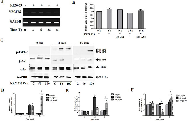 Figure 4: Alteration of VEGF/VEGFR2 signaling-related RNA and protein expression in stem cells following treatment with the vascular endothelial growth factor receptor 2 (VEGFR2) inhibitor, KRN633. (A) Expression of VEGFR2 gene in HB1.F3 cells. KRN633 at 50 μM or 100 μM was applied to HB1.F3 cells for up to 24 hours, during which time RNA was extracted at 3, 6, 9, and 24 h. To confirm the effects of KRN633, expression of the VEGFR2 gene was analyzed by RT-PCR. (B) Graph of the relative VEGFR2 mRNA level. (C) Expression of phospho-Erk1/2, phospho-Akt1/2/3, and c-fos protein in the HB1.F3.CD. Following KRN633 treatment (50 μM or 100 μM), protein was collected and separated by SDS-PAGE, then transferred to PVDF membrane and incubated with primary antibody, anti-p-Erk1/2, anti-p-Akt1/2/3, and anti-c-fos. (D) Graph of p-Erk1 related values. (E) Graph of p-Erk2 related values. (E) Graph of p-Akt1/2/3 related values. Each experiment was performed in triplicate and data shown are the mean ± SD. C: negative control (no treatment with KRN633) *p < 0.05 vs. negative control. #p < 0.05 vs. KRN633 50 μM treated cells.