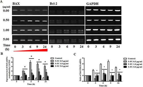 To determine the mechanism underlying 5-FU-induced alteration of BAX and Bcl-2 genes, we conducted RT-PCR analysis of breast cancer cells after serial diluted 5-FU treatment (0.5, 1.0, and 5.0 μg/ml), and total RNA was extracted at 3, 6, 9, and 24 h. The results indicated that the apoptosis pathway was inhibited by regulation of the expression of BAX and Bcl-2 genes (Figure 5A). Specifically, these experiments showed that expression of the BAX gene increased significantly when treated with 5-FU of 0.5, 1.0, and 5.0 μg/ml, and this persisted until 24 h (Figure 5B). The ratio of the anti-apoptotic gene/pro-apoptotic gene was measured by semi-quantitative RT-PCR, and all 5-FU treated cells showed low Bcl-2/BAX ratios due to induction of apoptosis in breast cancer cells (Figure 5C).