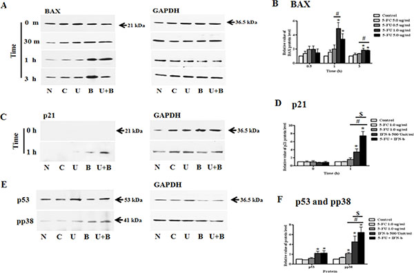 Figure 8: Synergistic effect of 5-fluorouracil (5-FU) and human interferon-beta (IFN-β) for treating MDA-MB-231 cells. MDA-MB-231 cells were co-treated with 5-FU 1.0 μg/ml and IFN-β 500 Unit/ml for different lengths of time. Cell lysates were used for immunoblotting analysis and incubated with primary antibodies, BAX, p21 (Cip1/Waf1), p53, and phospho-p38. (A) Expression of BAX protein. (B) The relative value of BAX protein. (C) Expression of p21 (Cip1/Waf1) protein. (D) The relative value of p21 (Cip1/Waf1) protein. (E) Expression of p53 and pp38 protein. (F) The relative value of p53 and pp38 protein. N: negative control (no treatment with 5-FU or 5-FC), C: 5-FC treatment (1.0 μg/ml), U: 5-FU treatment (1.0 μg/ml), B: IFN-β treatment (500 Unit/ml), U + B (5-FU 1.0 μg/ml and IFN-β 500 Unit/ml co-treatment). Data are presented as the mean ± SD of three different experiments each performed in triplicate. *p < 0.05 vs. negative control. #p < 0.05 vs. 5-FU 0.5 μg/ml treated cells. $p < 0.05 vs. 5-FU 5.0 μg/ml treated cells.