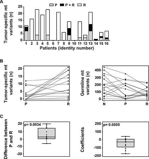 aNumber of tumor-specific mt variants: P, primary tumor; R, relapse tumor. Variants with an allele frequency of at least 1% were analyzed.