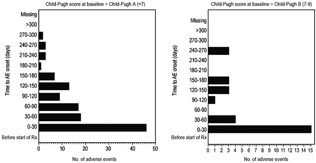 Figure 2: Time to onset of adverse events greater than grade 1 by Child-Pugh status