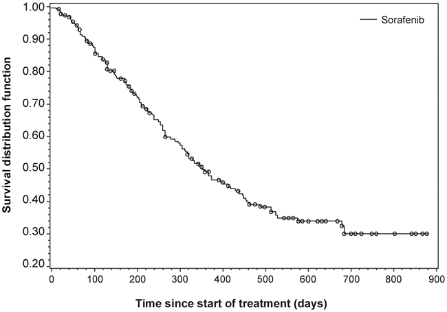 Patients who received at least one dose of sorafenib and underwent at least one follow-up assessment were evaluable for safety and efficacy. All AEs were graded according to the National Cancer Institute Common Terminology Criteria for Adverse Events version 3.0. Descriptive statistics, such as frequency, proportion, mean, median, standard deviation, 95% confidence intervals, and quartiles, were calculated for all baseline, safety, and efficacy data. Kaplan–Meier estimates were calculated for the OS, PFS, and TTP efficacy end points.