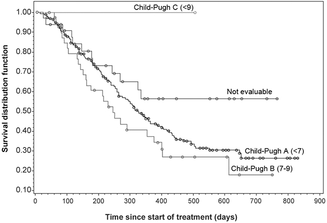Median OS was 322 days in the Chinese subset (Figure 3). The OS was longer in Child-Pugh A patients than in Child-Pugh B patients (Table 4, Figure 4). Child-Pugh B patients showed a similar progression-free survival (PFS) to that of Child-Pugh A patients. Median time to progression (TTP) could not be compared between subgroups due to the high censoring rate in the Child-Pugh B and C groups.