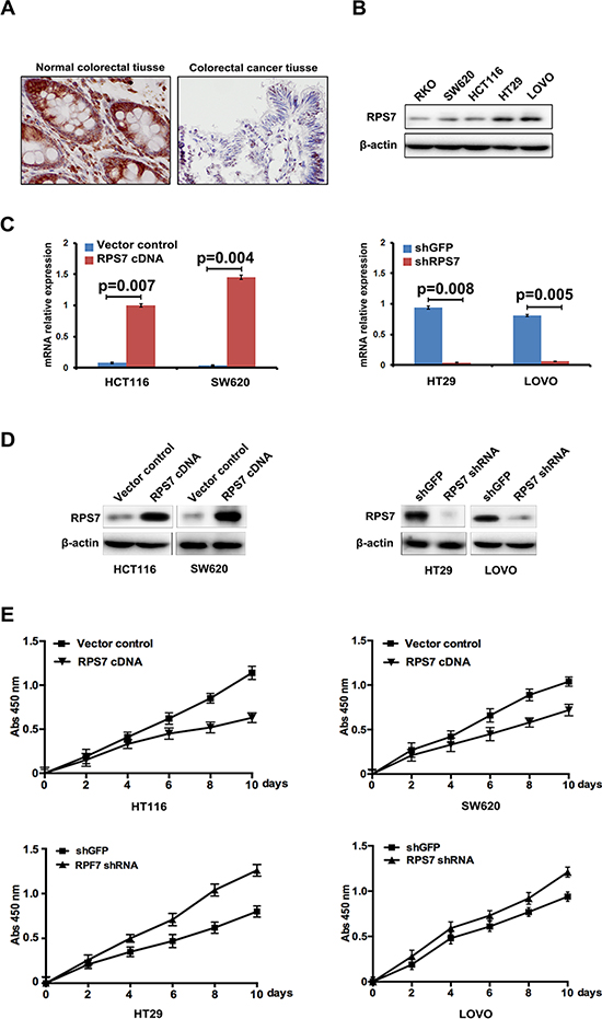 Figure 1: Expression of RPS7 in normal colorectal tissues, CRC tissues and CRC cell lines and the effect of RPS7 on CRC cell proliferation. (A) Detection of expression level of RPS7 in colorectal normal and cancer tissues by IHC. (B) Detection of RPS7 by Western blotting in RKO, SW620, HCT116, HT29 and LOVO cells. (C–D) Analyses of RPS7 by realtime-PCR (C) and Western blotting (D) in cell expressing RPS7 cDNA or shRNA and the corresponding control plasmids. (E) Detection of cell proliferation by CCK8 (P < 0.05). Error bars = 95% confidence intervals (CIs).