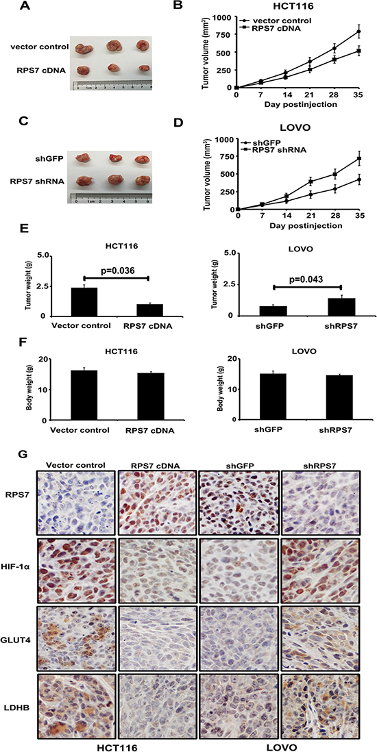 Figure 4: Xenograft tumor burden in mice with overexpression or silencing of RPS7. (A–D) In vivo tumorigenesis examined by animal assay and subcutaneous tumor growth from mice injected with cells expressing either RPS7 cDNA or shRNA and the corresponding controls (P < 0.05). Error bars = 95% CIs. (E–F) Figures show tumor and body weights of mice at the end of observation. (G) Immunohistochemical staining of xenograft tumor tissues. Tissues were stained with rabbit anti-RPS7, HIF-1α, GLUT4 and LDHB antibodies and visualized with donkey anti-mouse secondary antibody (Magnification × 400).