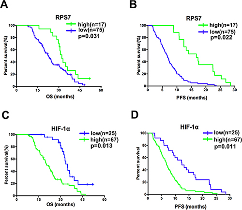 Further, we explored whether the expression levels of RPS7 and HIF-1α influence the survival of CRC patients. So we performed Immunohistochemical staining (IHC) to test the expression level of RPS7 and HIF-1α in 92 CRC patients with IV stage disease, who received 5-fluoropyrimidine, leucovorin, and oxaliplatin (FOLFOX) or capecitabine and oxaliplatin (XELOX) as first-line chemotherapy between December 2006 to April 2011 in FUSCC with complete follow-up information. The mean age of these 92 patients was 56.04 years (ranging from 34 to 75 years) (Table 4), 56 (60.9%) patients being male and 36 (39.1%) patients being female. Among them, there were 54 (58.7%) patients with primary cancer located at rectum and the rest were located at colon. 33 (35.9%) patients suffered multiple organs metastasis at diagnosis, and the other 59 (64.1%) patients beard single organ metastasis. Besides, synchrony metastasis occurred in 63 (68.5%) patients. The mean follow-up interval was 26.76 months (ranging from 2.53 to 58.10 months). Until the last follow-up, all the patients suffered progressive disease (PD) for the first-line chemotherapy, and 75 (82.4%) patients were dead. The mean progression-free survival (PFS) was 9.19 months (ranging from 1.43 to 28.50 months) and the mean overall survival (OS) was 25.07 months (ranging from 7.83 to 52.10 months).