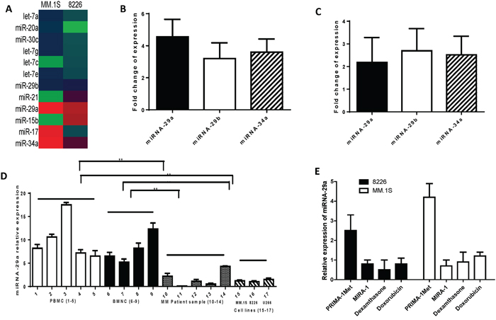 Figure 1: Differential expression of miRNAs between MM cells treated with PRIMA-1Met or DMSO control. A. MM.S or 8226 cells were treated with PRIMA-1Met (10 or 20 μM, respectively). After 8h cells were harvested to isolate total RNA including miRNA. miRNA was reverse transcribed followed by qPCR array analysis in a 96-well plate targeting the cancer pathway finder (MM.1S) or apoptosis pathway (8226). Data were analysed by the online software (SABiosciences) to see the differential expression of the miRNAs. B and C. cDNAs were further used to validate the expression of miRNAs (miRNA-29a, miRNA-29b, and miRNA-34a) in MM.1S (B) and 8226 (C) cells. Fold-changes of the genes are shown after normalizing the data with to a set of housekeeping genes. D and E. miRNA-29a expression in MM patient samples and normal hematopoietic cells. (D) miRNA-29a expression is significantly higher in normal peripheral blood mononuclear cells (PBMC) or bone marrow mononuclear cells (BMNC#1) compared to MM patient samples and cell lines. RNAs were isolated from purified patient MM cells, PBMCs, and BMNCs from healthy donors, and the cultured MM cell lines, followed by analysis of basal expression level of miRNA-29a using qRT-PCR. Raw Ct values were normalized to housekeeping SNORD61 and relative expression was calculated using the comparative Ct methods. Results shown are means ±SD. (E) MM.1S and 8226 cells were treated with PRIMA-1Met (10 and 20 μM, respectively), MIRA-1 (10 and 20 μM, respectively), dexamethasone (5 μM), or doxorubicin (5 μM). Control cells were treated with DMSO. Eight hours after treatment, cells were harvested for RNA isolation and expression of miRNA by qPCR as described earlier.