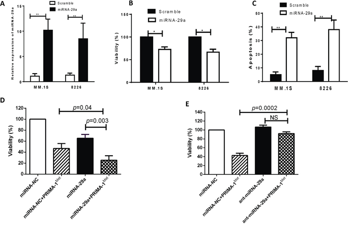 Figure 2: Overexpression of miRNA-29a in MM cells resulted in decrease of cell viability and increase of apoptosis. MM.1S or 8226 cells were transiently transfected with either pre-miRNA-29a or scrambled miRNA using the HiPerFect tranfection reagent. A. Forty-eight hours after transfection, RNA was isolated from cells transfected with scrambled or miRNA-29a and miRNA expression was analyzed by qPCR. B and C. The transfected cells were examined for cell viability and apoptosis by MTT (B) and Annexin V binding assay (C). Results shown are means ±SD (*p<0.05, **p<0.01). D and E. Effect of miRNA-29a overexpression or inhibition on PRIMA-1Met-induced cytotoxic response in MM cells. MM.1S cells were transiently transfected with either miRNA-29a expression plasmid (D) or synthetic inhibitor of miRNA-29a (E) along with their negative control. Twenty four hours after transfection cells were further treated with PRIMA-1Met and viability of the cells was measured by MTT assay 48h after treatment.