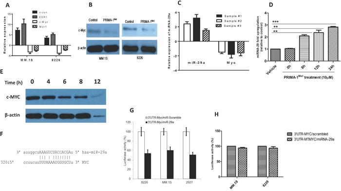 Figure 3: PRIMA-1Met down-regulates the transcriptional and translational expression of c-Myc in MM cells. A. MM.1S and 8226 cells were treated with 10 or 20 μM PRIMA-1Met for 8h. Cells were harvested for RNA isolation and cDNA synthesis. Resulting cDNA was analysed for the expression of c-Myc and other genes by qPCR. B. MM.1S and 8226 cells were treated with PRIMA-1Met as indicated above after which total proteins were isolated for WB analysis. C. Primary MM samples obtained from 3 MM patients were treated with 20 μM PRIMA-1Met and expression of miRNA-29a and c-Myc was analysed by qPCR. D and E. Time course analysis of miRNA-29a (D) and c-Myc protein (E) after treatment with 10 μM PRIMA-1Met in MM.1S cells. F-H. c-Myc as a target for miRNA-29a. (F) Sequence alignment of the miRNA-29a seed sequence with c-Myc 3’-UTR. Matched nuclear acid base pairs were linked as “ - ”. (G, H) MM.1S and 8226 cells were transiently co-transfected with the reporter plasmids (pEZX-MT-Control, pEZX-3’-UTR/MYC-WT, or pEZX-3’-UTR/MYC-MT) and miRNAs (miRNA-29a or scrambled control miRNA). Cells were harvested and lysed 48h after transfection, followed by measurement of relative fluorescence intensity of firefly and Renilla luciferase according to manufacturer's instruction. Luciferase activities were analyzed as relative activity of firefly to Renilla. Results shown are means ± SD. *p<0.05.