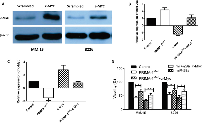 Figure 4: Overexpression of c-Myc reverted apoptosis and cell viability induced by miRNA-29a in MM cells. MM.1S and 8226 cells were transiently transfected with expression plasmid of c-Myc. A. Overexpression of c-Myc was validated by western blotting in both cell lines. B, C. Inverse co-relationship between miRNA-29a and c-Myc was confirmed in MM.1S cell line by overexpression of c-Myc or treatment with PRIMA-1Met. D. Cells were then analysed for cell viability using the MTT assay. Results shown are representative of means ±SD (n = 3). *P<0.05, ** P<0.01.