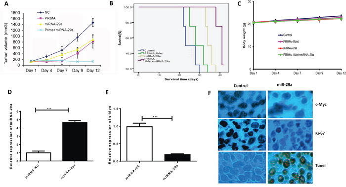 To further study the potential therapeutic applicability of our findings as a novel anti-MM treatment, we examined the effect of miRNA-29a in combination with PRIMA-1Met in MM xenograft model. When tumors became measurable, mice were assigned into 4 groups (5 mice/group). One group of mice was injected with PRIMA-1Met at 50 mg/kg given intraperitoneally (i.p.). miRNA was delivered at a lower concentration (10μg) by lipid-based methods as explained above. Another group was treated with combination of PRIMA-1Met and miRNA-29a mimics. Control group was treated with non-targeting miRNA and PBS. Treatments were performed once daily for 14 days. Tumor growth, body weight, and survival of the mice were monitored. Co-treatment of PRIMA-1Met and miRNA-29a mimics resulted in significant inhibition of tumor growth (Figure 6A) and prolongation of survival (Figure 6B) in mice compared to the mice treated with either PRIMA-1Met or miRNA-29a mimics or vehicle. No significant changes in the body weight of the mice in these groups was observed indicating that doses of the miRNA-29a mimics or PRIMA-1Met were tolerable (Figure 6C). The high expression of miRNA-29a and low expression of c-Myc observed by qPCR in tumor samples of the miRNA-29a-treated mice (Figure 6D-E) validate successful delivery of miRNA-29a mimics. The expression of Ki-67 and c-Myc decreased and that of TUNEL increased in tumor samples from miRNA-29a-mice compared to samples obtained from the vehicle-treated mice (Figure 6F).