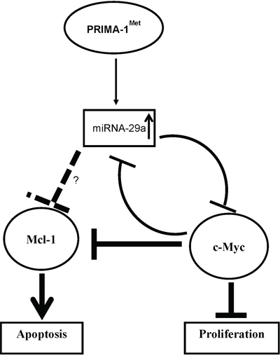 Figure 7: Scheme of proposed mechanism for regulation of c-Myc by miRNA on PRIMA-1Met treatment. miRNA-29a-mediated targeting of c-Myc by PRIMA-1Met may occur as a direct inhibitory effect of the miRNAs. Alternatively, such inhibition can be seen as an indirect effect of the miRNAs which may be mediated by other targets including Mcl-1 or Bcl-2.