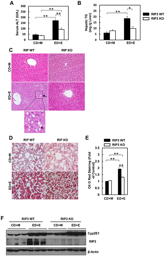 ALD: Alcoholic liver disease; ALT: Alanine aminotransferase; CD+M: Control diet+maltose; cIAPs: inhibitor of apoptosis proteins; CYP2E1: Cytochrome P450 2E1; ED+E: Ethanol diet+ethanol; FLIPs: FLICE-like inhibitory proteins; GSH: glutathione; H & E: heamatoxylin and eosin; IRF3: interferon regulator factor 3; KO: knockout; Ly6B: anti-lymphocyte antigen B superfamily; MCL-1: Myeloid Cell Leukemia 1; MLKL: mixed lineage kinase domain-like; 7-Nec1: 7-Cl-O-Nec-1; PSMA2: proteasome subunit alpha type-2; PSMB5: proteasome subunit beta type-5; PSMC1: proteasome 26S subunit, ATPase 1; RHIM: RIP homotypic interaction motif; RIP1: Receptor-interacting serine/threonine-protein kinase 1; RIP3: Receptor-interacting serine/threonine-protein kinase 3; TG: Triglycerides; TNF-α: tumor necrosis factor-α.