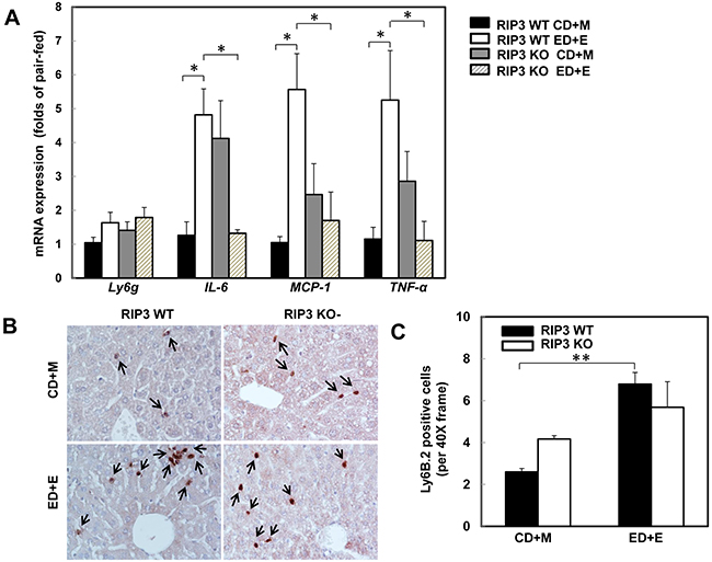 Figure 3: RIP3 KO mice decrease the hepatic expression of inflammatory cytokine genes but have no effects on Gao-binge alcohol-induced neutrophil infiltration. WT and RIP3 KO mice were treated with the Gao-binge model. A. RNA from mouse livers was used to measure gene expression by qPCR. Results were normalized to β-actin and expressed as fold change compared to WT control. Data shown are means ± S.E (n = 3-4 mice per group. *p<0.05; by one-way ANOVA). B. Representative images were shown from Ly6B immunohistochemistry after Gao-binge treatment. Arrows denote the Ly6B positive neutrophils. C. The number of Ly6B positive neutrophils was counted from at least 22 areas (400 X magnification) each mouse. Results shown are means ± S.E. (n = 4-6 mice per group. **p<0.01 compared to WT control by one-way ANOVA).