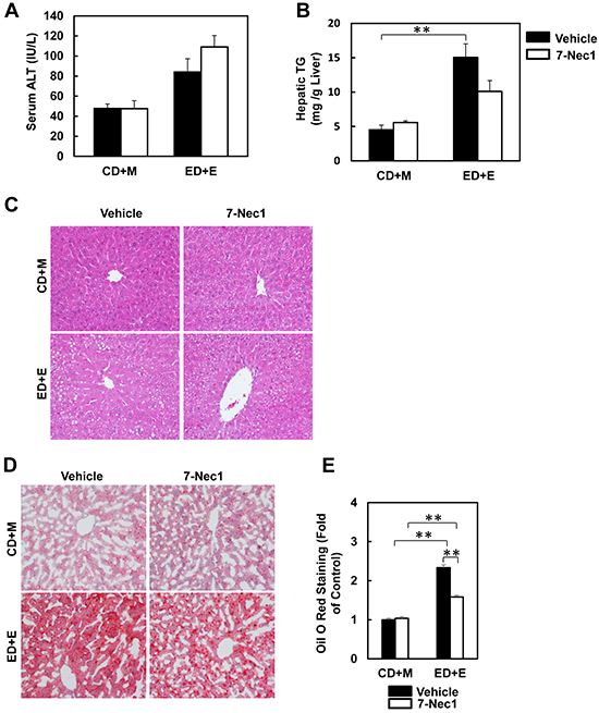 Figure 4: 7-Nec1 does not protect against Gao-binge alcohol treatment-induced liver injury and steatosis. WT mice were treated with Gao-binge model. At the last day of feeding, mice were either injected with 7-Nec1 (i.p., 5 mg/kg) or vehicle (4% methy-β-cyclodextran in PBS, pH7.4) before ethanol (5 g/kg) or maltose dextrin (9 g/kg) gavage. A. Serum ALT levels were determined and B. hepatic triglyceride contents were measured using whole liver homogenates. Data shown are means ± S.E. (n = 4-6 mice per group. *p<0.05; ** p<0.01 by one-way ANOVA). C. Representative H&E images and D. Oil Red O staining images are shown (200x magnification). Oil Red O staining was quantified using ImageJ software E. At least 6 images from each mouse were quantified and data were normalized to the control group. Data shown are means ± S.E. (n = 3 mice per group. *p<0.05; ** p<0.01 by one-way ANOVA).