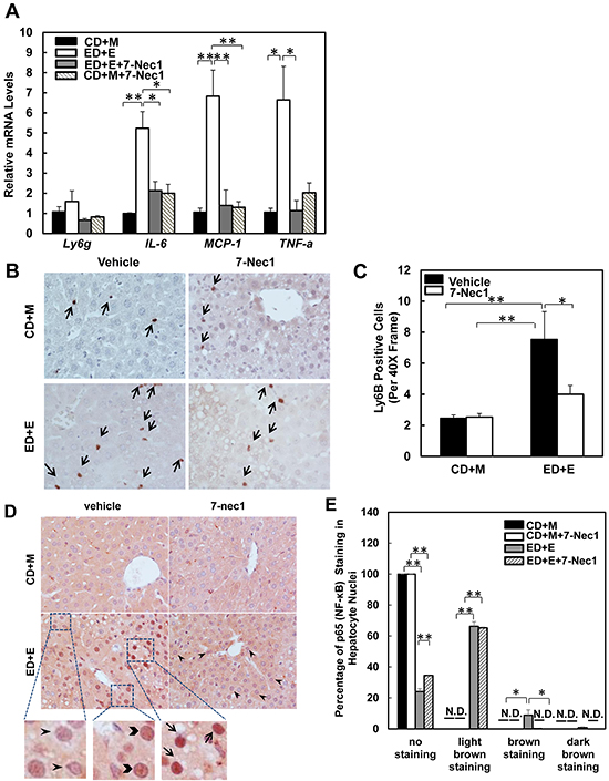 Figure 5: 7-Nec1 decreases hepatic inflammation induced by Gao-binge alcohol treatment. A. RNA from mouse livers was used to measure gene expression by qPCR. Results were normalized to β-actin and expressed as fold change compared to WT control. Data shown are means ± S.E (n = 4-5 mice per group. *p<0.05; **p<0.01 by one-way ANOVA). B. Representative images are shown from Ly6B immunohistochemistry. Arrows denote the Ly6B positive neutrophils. C. The number of Ly6B positive neutrophils was counted from at least 20 areas (400 X magnification) each mouse. Results shown are means ± S.E. (n = 3-5 mice per group. *p<0.05 compared to WT control by one-way ANOVA). D. Paraffin-embedded liver tissues were subjected to immunohistochemistry for NF-κB subunit p65. Representative images were shown after Gao-binge alcohol treatment with or without 7-nec1. Boxed areas were enlarged and shown in the lower panel. The arrowheads represent light brown staining of p65, the chevrons show brown staining of p65 and the arrows indicate dark brown staining of p65 in hepatocyte nuclei. E. The percentage of different intensities of p65 staining. Results are presented as means± S.E. (n = 3-4, *p<0.05; **p<0.01 by one-way ANOVA). N.D., not detected.
