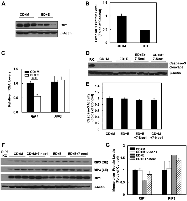 Figure 6: Gao-binge treatment decreases RIP1 expression and 7-Nec1 treatment does not affect RIP1 and RIP3 expression as well as caspase-3 activation. WT mice were treated with Gao-binge model. A. Total liver lysates were subjected to western blot analysis. B. Densitometry analysis of (A). The levels of RIP1 were normalized to the loading control (β-Actin). Values represent means±S.E. (n = 3). C. RNA from mouse livers was used to measure gene expression by qPCR. Results were normalized to β-actin and expressed as fold change compared to WT control. Data shown are means ± S.E (n = 3-4 mice per group. *p<0.05 by one-way ANOVA). D. Total liver lysates were subjected to western blot analysis (an LPS/GalN-treated mouse liver lysate was used as a positive control (P.C.) for cleaved caspse-3). E. Caspase-3 activities were measured using total liver lysates. Values represent means±S.E. (n = 3, no statistical significant difference). F. Total liver lysates were subjected to western blot analysis. G. Densitometry analysis of (F) (n = 3 mice, a RIP3 KO mouse liver lysate was used as a negative control).