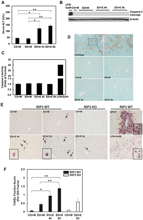 Figure 7: Gao-binge treatment induces necrosis but not apoptosis in mouse livers. WT mice were fed with control or ethanol diet for 10 days and at day 10 the mice were either gavaged with maltose or ethanol for 4 or 8 hours. A. Serum ALT levels were determined. (n = 4, *p<0.05, **p<0.01 by one-way ANOVA). B. Total liver lysates were subjected to western blot analysis (an LPS/GalN-treated mouse liver lysate was used as a positive control for cleaved caspase-3). C. Caspase-3 activities were measured using total liver lysates. Values represent means±S.E. (n = 4, no statistical significant difference). D. Representative images of immunohistochemistry for cleaved caspase-3. A mouse liver from LPS/GalN treatment served as a positive control. E. Paraffin-embedded liver tissues were subjected to immunohistochemistry for TUNEL staining. APAP group and LPS/GalN group served as positive controls for necrosis and apoptosis, respectively. F. The numbers of TUENL positive nuclei were counted from at least 8 areas (200 X magnification) each mouse. Results shown are means ± S.E. (n = 3-5 mice per group. *p<0.05, **p<0.01 compared to WT control by one-way ANOVA).