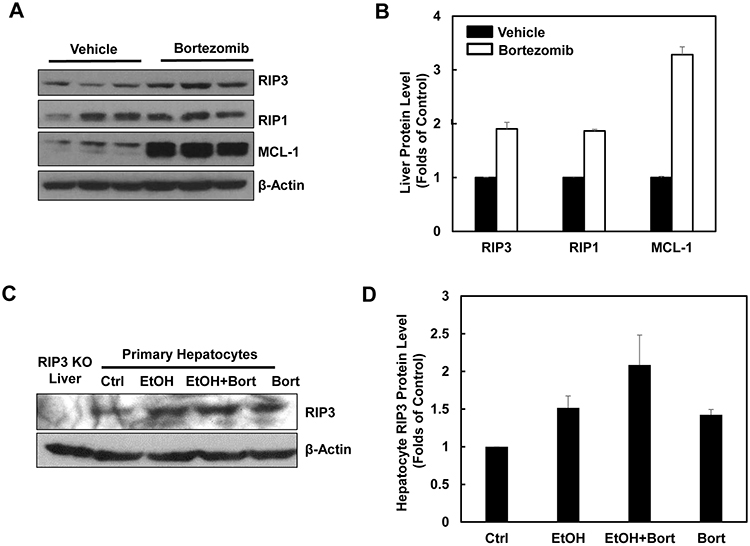 Figure 9: Pharmacological inhibition of proteasome increases protein levels of hepatic RIP1 and RIP3. A. WT mice were either injected with Bortezomib (i.p., 1 mg/kg) or vehicle (0.02% DMSO in PBS) for 24 hours followed by a second booster injection for another 6 hours. Total liver lysates were subjected to western blot analysis. B. Densitometry analysis of (A). The levels of RIP3, RIP1 and MCL-1 were normalized to the loading control (β-Actin). Values represent means±S.E. (n = 3). C. Primary cultured mouse hepatocytes were treated with ethanol (80 mM) in the presence or absence of Bortezomib (200 nM) for 6 hours. Total cell lysates were subjected to western blot analysis. A liver lysate from RIP3 KO mouse liver was used as a negative control. D. Densitometry analysis of (C). Values represent means±S.E. (n = 3 independent experiments).