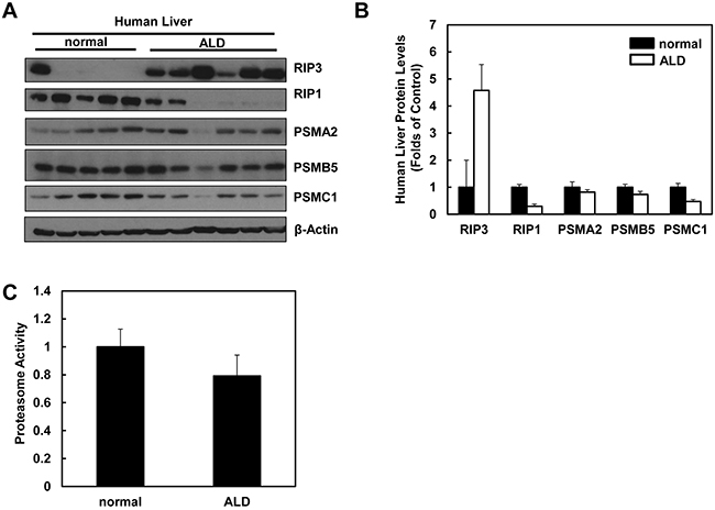 Impaired proteasomal functions and increased hepatic RIP3 protein levels in human ALD