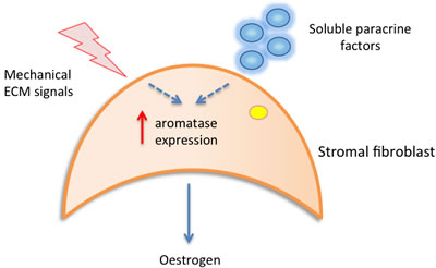 Figure 1a: Local paracrine and mechanical signals may contribute to increased stromal aromatase expression, resulting in increased local oestrogen production and epithelial cell proliferation.