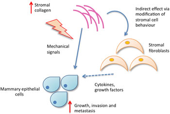 Figure 1b: Increased collagen density may influence mammary epithelial cell behaviour directly via mechanistic signals or indirectly via modifying stromal cell behaviour.