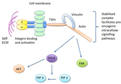 Figure 2: The focal adhesion component vinculin is activated in response to stiff ECM, forming a stable talin-vinculin-actin complex which promotes pro-oncogenic signalling pathways.