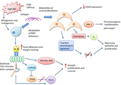 A summary of our current understanding of the complex stromal biological pathways conferring MD-associated breast cancer risk is displayed in Figure 4 below.