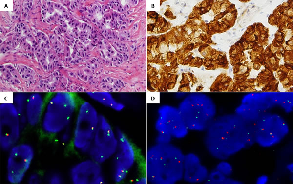 Figure 1: Representative images from case 2 ROS1-rearranged: A. Hematoxylin and eosin, 20x. Adenocarcinoma showing a predominantly acinar pattern. B. ROS1 IHC, 20x. Cytoplasmatic +3/+4 staining pattern. C. ROS1 FISH, 100x. Break-apart probe showing an atypical rearranged pattern with 5’ROS1 deletions (1F2G). D. CD74 FISH, 100x. Break-apart probe showing a typical rearranged pattern with fused and split signals (2F2O2G).